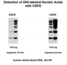 Highly sensitive and specific detection of DIG-labeled nucleic acids in Southern and northern blots and plaque or colony lifts with anti-DIG-AP conjugate and the chemiluminescent substrate CSPD. Chemiluminescent detection with CSPD (following the instructions of the kit) is as sensitive as radioactive methods, but requires much shorter exposure times.